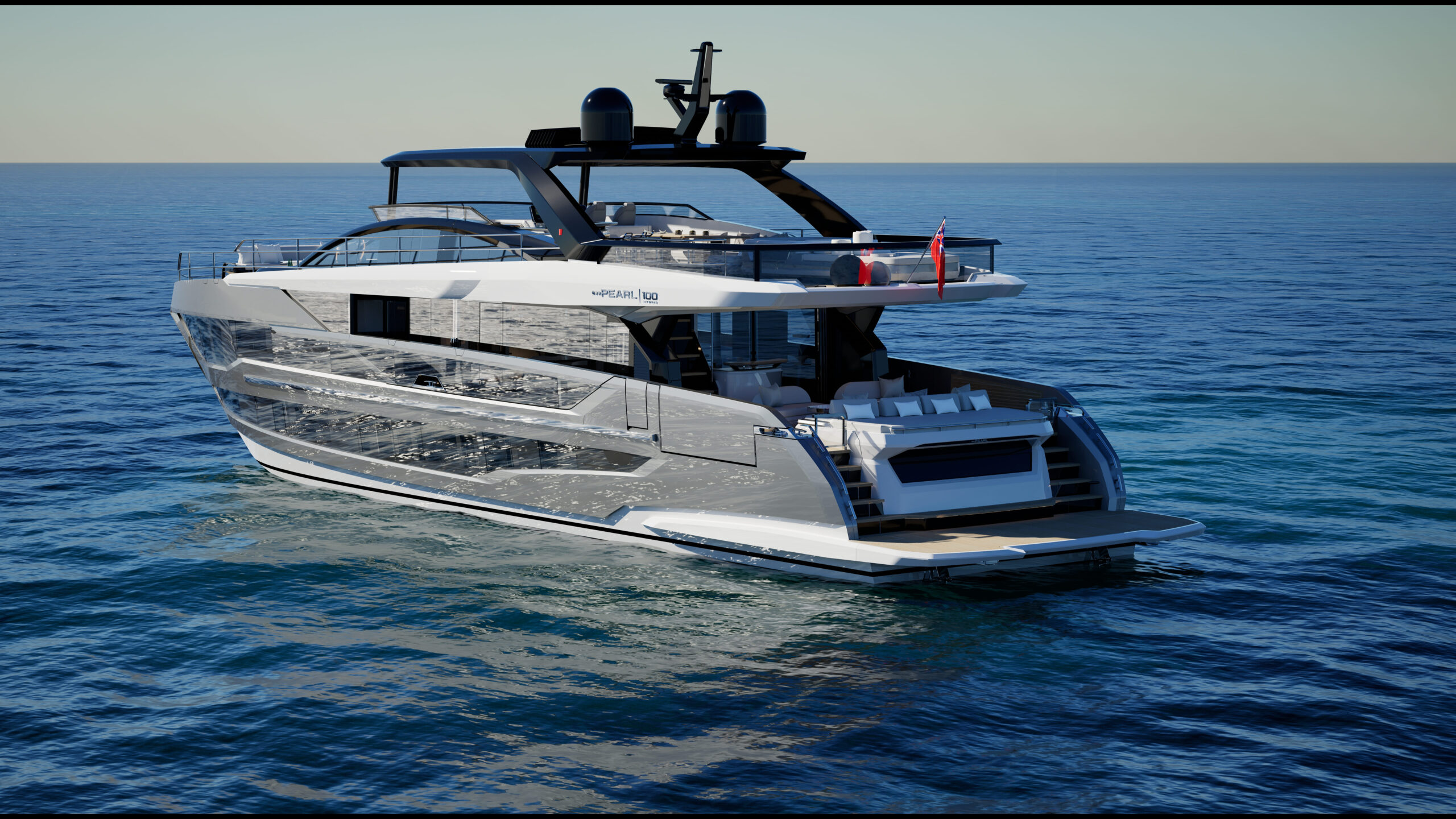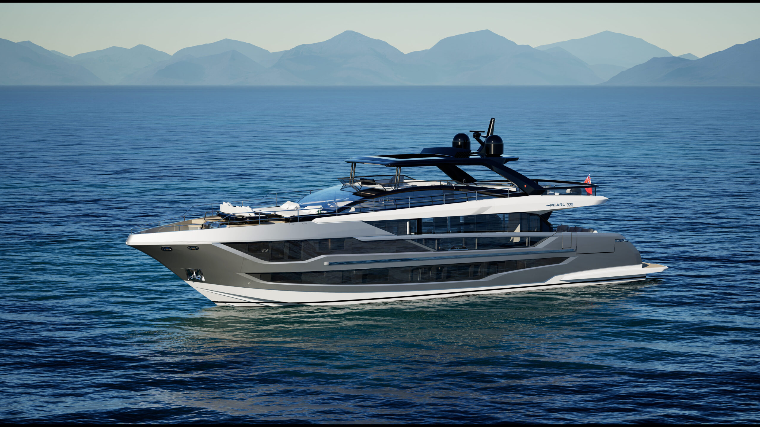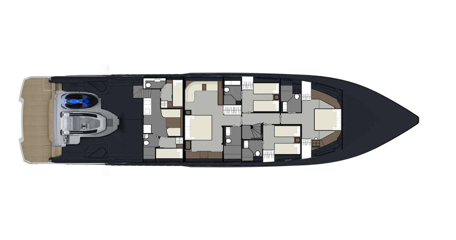 The Pearl 100 Hybrid is the shipyard’s most ambitious model to date—its first to feature hybrid propulsion and setting a new benchmark for sustainable luxury. At 30 meters, this raised pilothouse superyacht combines elegant design and responsible engineering, offering five beautifully appointed staterooms, including two full-beam master suites (one on the main deck with private terrace, one midship below), a forward VIP double, and two twin guest cabins, all en-suite.
