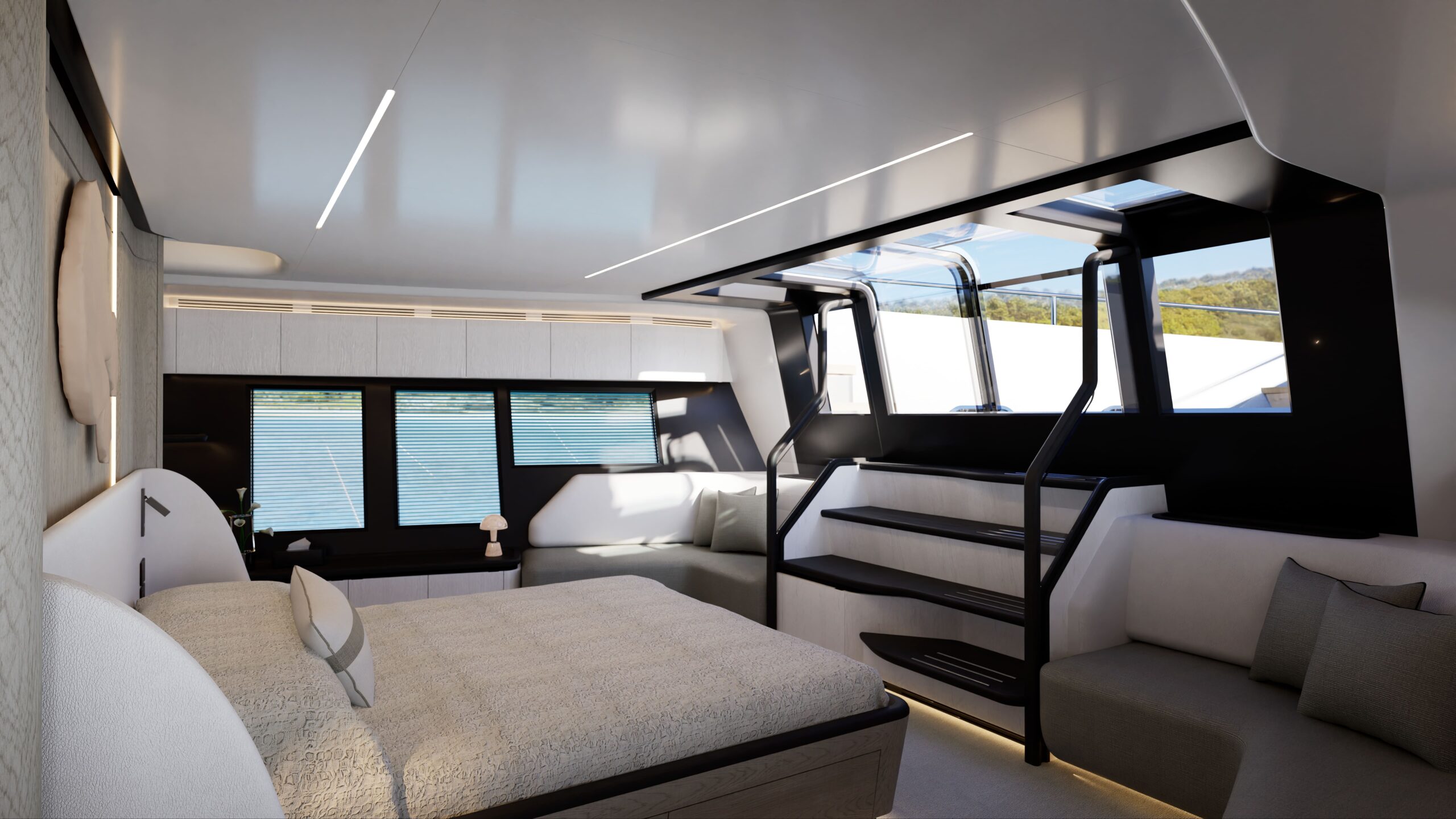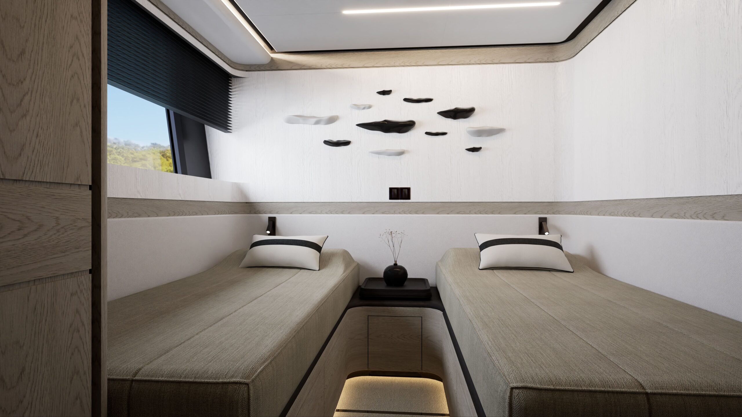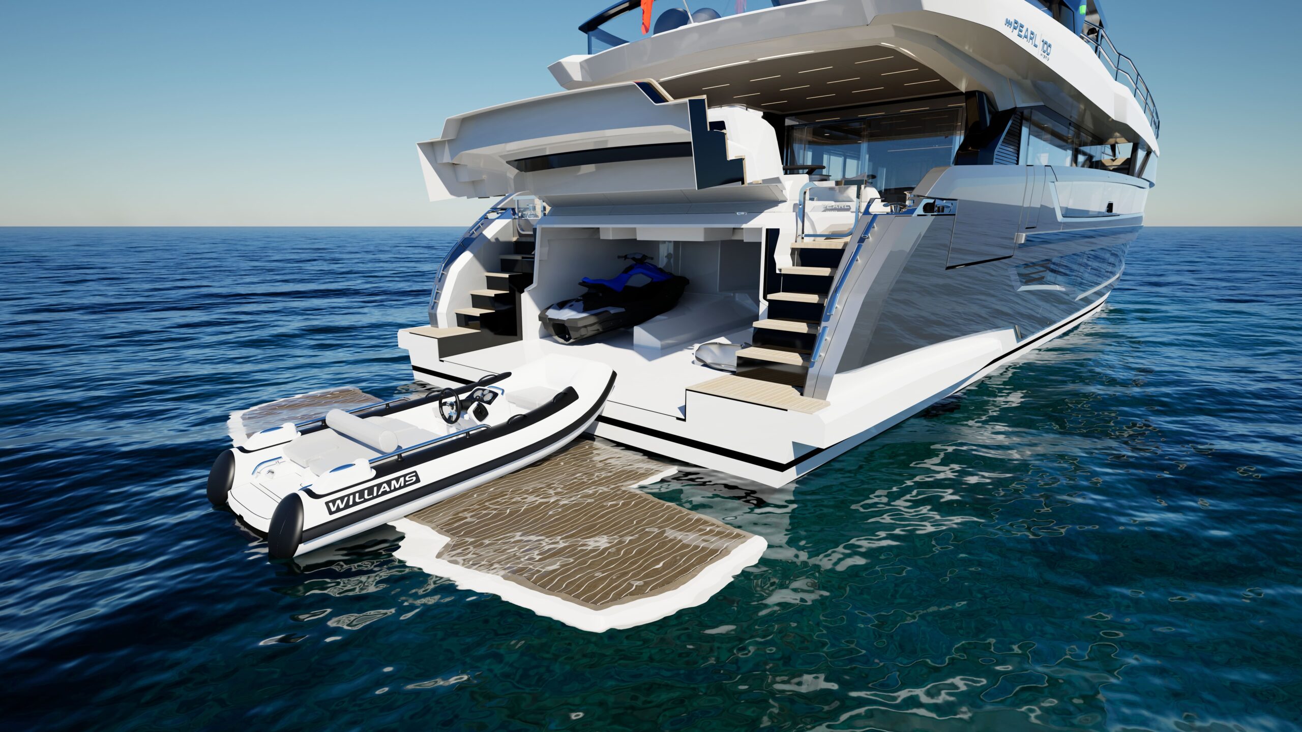 The Pearl 100 Hybrid is the shipyard’s most ambitious model to date—its first to feature hybrid propulsion and setting a new benchmark for sustainable luxury. At 30 meters, this raised pilothouse superyacht combines elegant design and responsible engineering, offering five beautifully appointed staterooms, including two full-beam master suites (one on the main deck with private terrace, one midship below), a forward VIP double, and two twin guest cabins, all en-suite.
