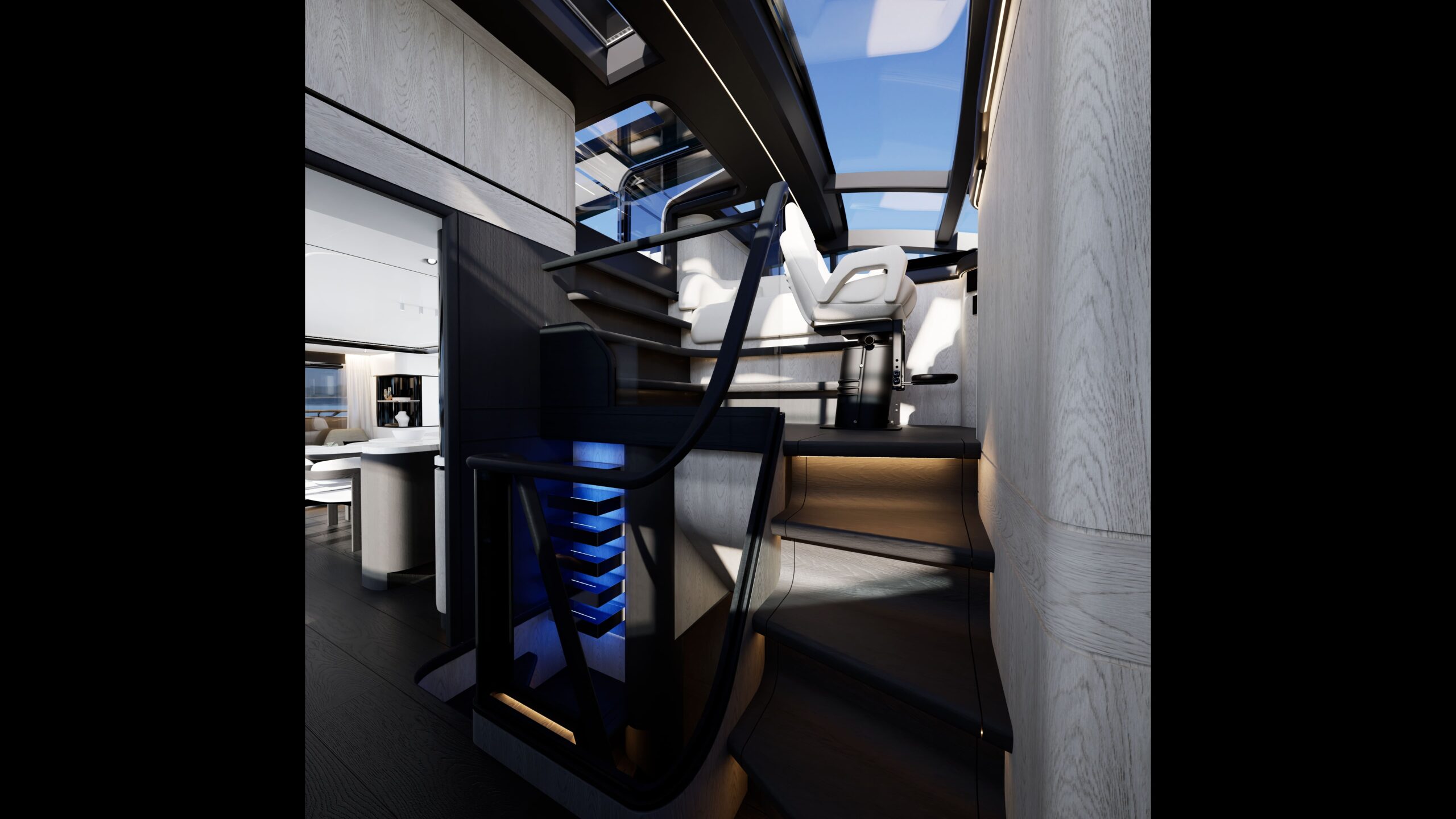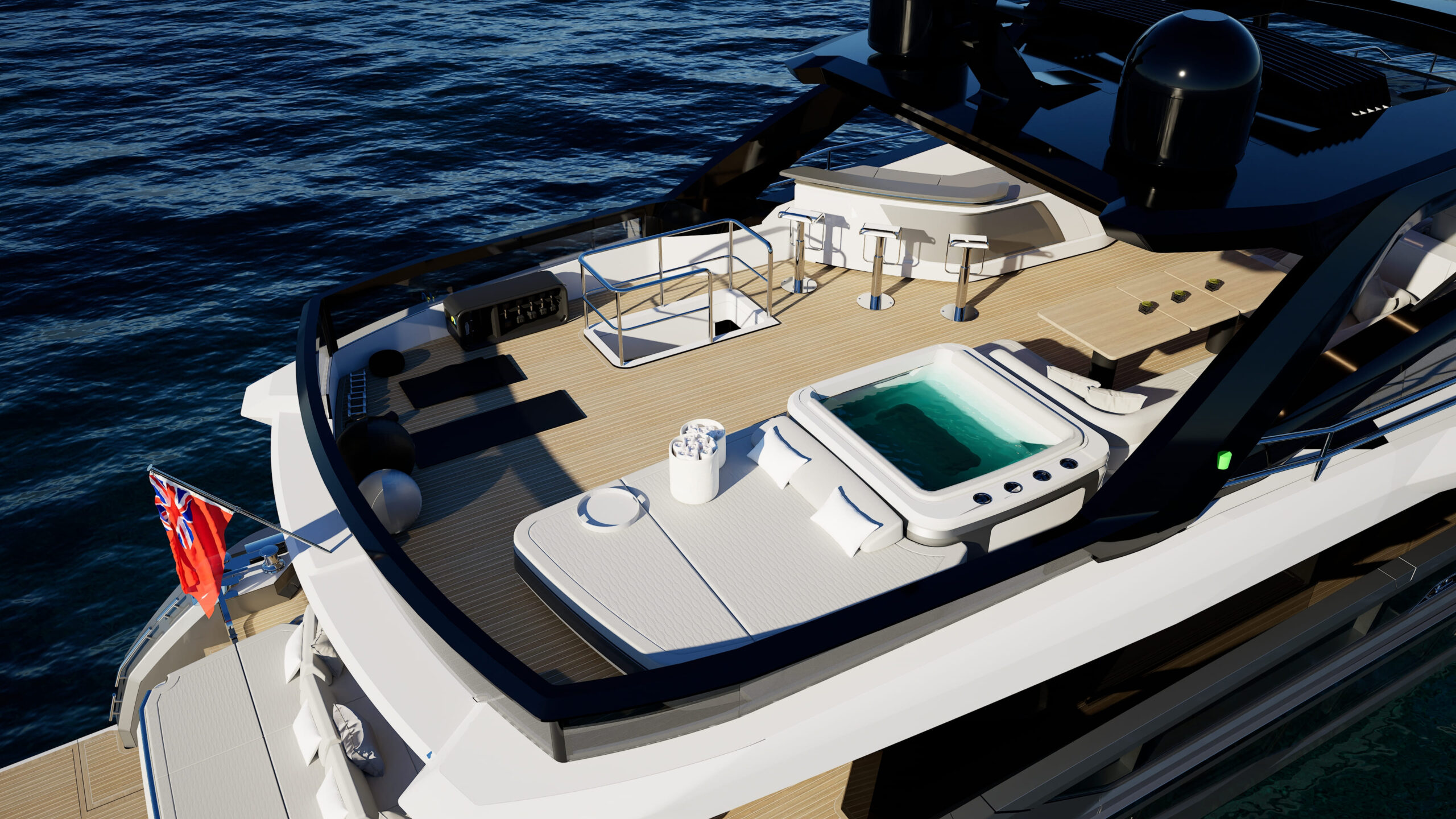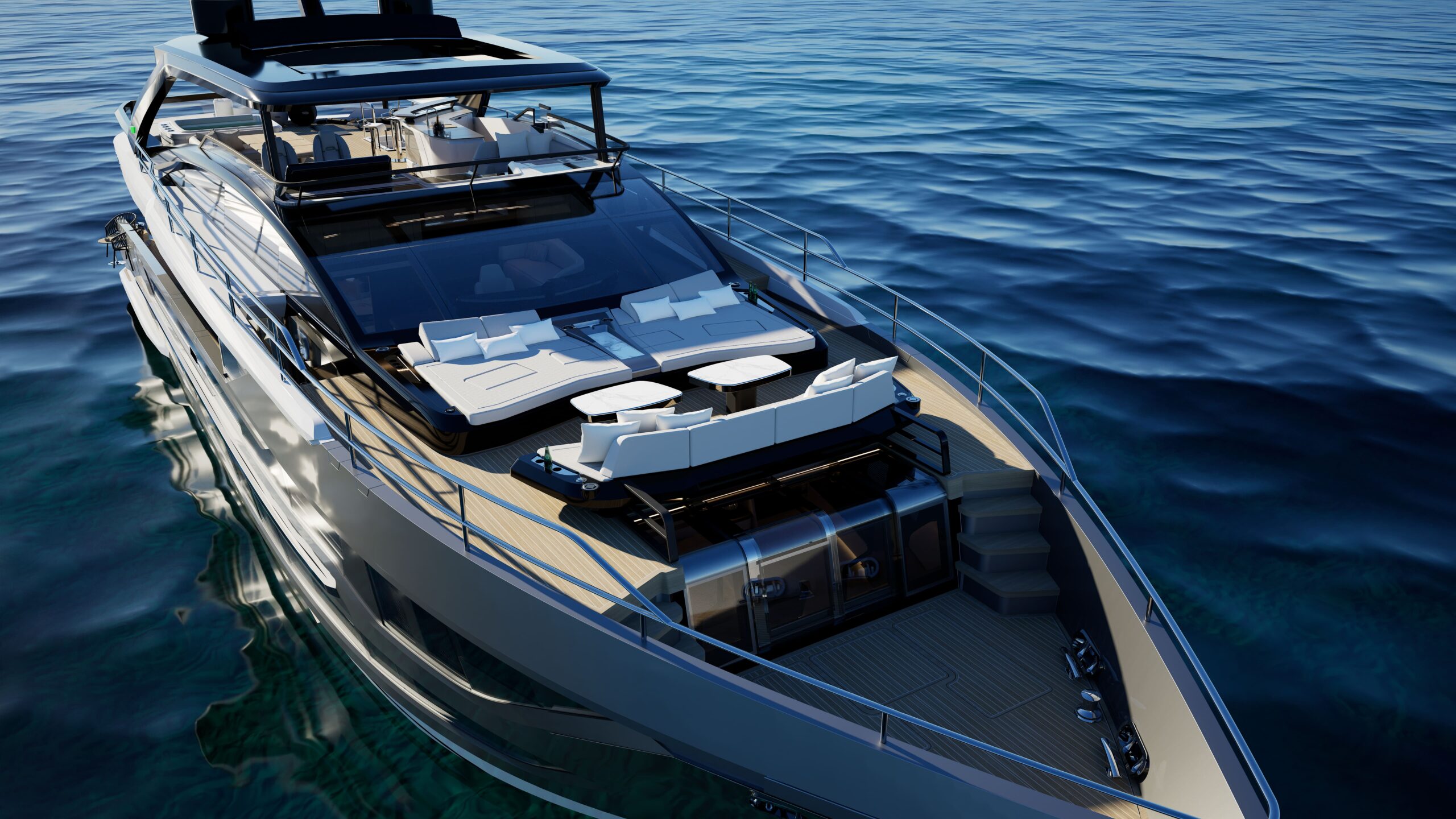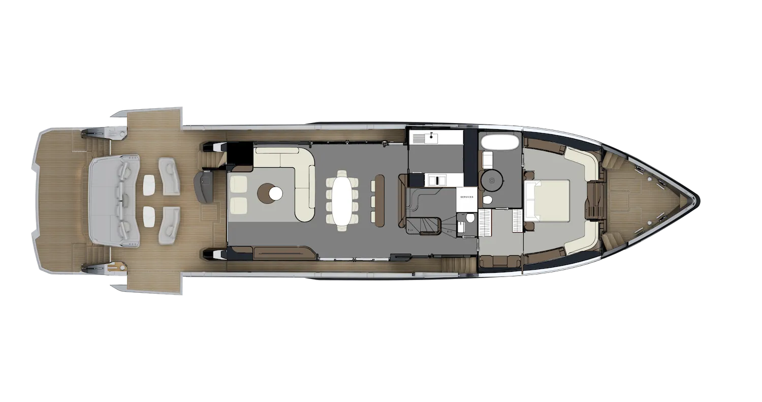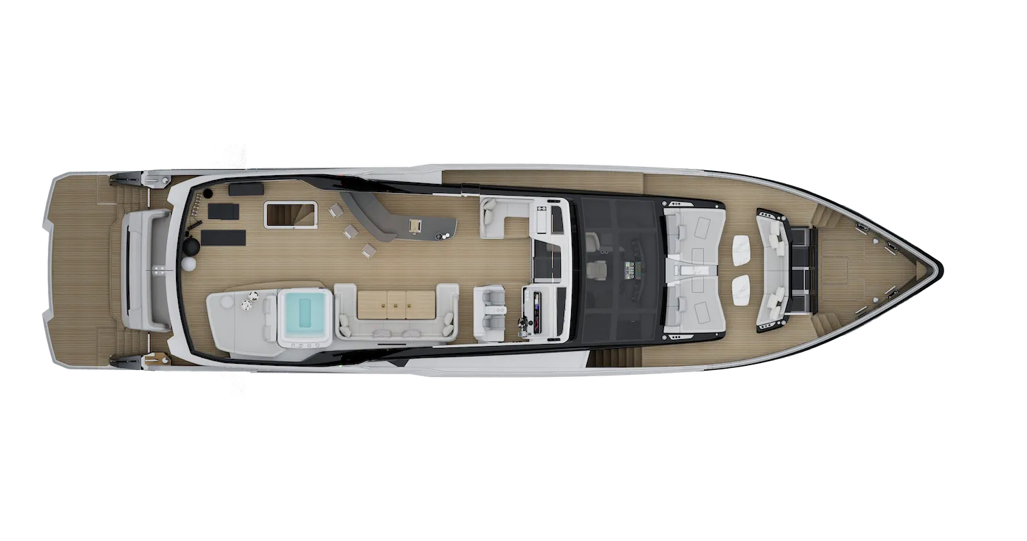 Exterior deck design to minimise crew/guest crossover. Expansive flybridge with direct access to both aft cockpit and foredeck