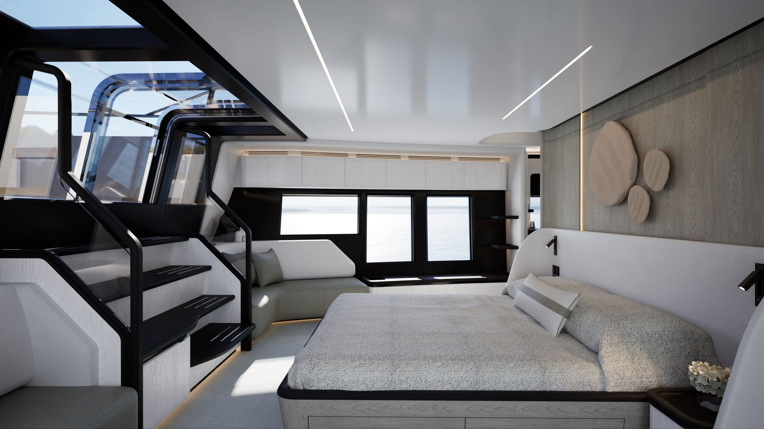 Five guest cabins, including two master suites. Main deck master with private foredeck access
